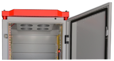 The cabinet has protection degree IP55, built-in lock for protection against unauthorized access, thermal insulation layer, door opening sensor, temperature controlled ventilation, with replaceable filters.